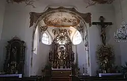 Der Innenraum des Langhauses ist mit einer Flachdecke überspannt, der des Chors mit einem Stichkappengewölbe. Die Fresken hat 1760 Ignaz Baldauf eingebracht. Der im frühen 18. Jahrhundert gebaute Hochaltar wurde um 1760 verändert.