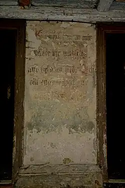 Der Bogen in der Ostwand dient seither als Durchgang in das Kirchenschiff und verfügt über einen mittig angeordneten Stützpfeiler. Auf diesem ist folgende Inschrift angebracht: