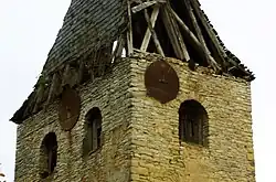 Damals wurden zudem aus statischen Gründen an beiden (West-)Ecken des Turms Strebpfeiler angebracht.[19] Die heutigen Schallöffnungen (je zwei an der Ost- und West- sowie je eine an Nord- und Südseite) liegen seither über diesem ehemaligen Glockengeschoss und werden von einem geknickten schiefergedeckten Zeltdach abgeschlossen, das durch mehrere Stürme seit 2015 inzwischen eingestürzt ist.
