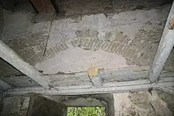 Da das alte Kirchenschiff ursprünglich westlich vom Turm stand, scheinen die Rundbögen einstmals der Zugang zur Apsis gewesen zu sein, was aber nur vermutet werden kann, da keine Unterlagen dazu überliefert sind.[8] Über dem (Eingangs-)Bogen auf der Westseite zeichnet sich ein weiterer, ca. 2,00 m breiter Rundbogen ab, der in der Außenfassade erkennbar, aber ebenflächig mit dieser zugemauert ist. Von innen ist er als zurückgesetzte Laibung noch deutlich sichtbar.