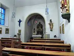 Der Kirchturm mit spitzem Helm steht als Chorturm im Osten. Der Chorraum im Untergeschoss besitzt ein Kreuzrippengewölbe. Das flachgedeckte Langhaus weist drei Fensterachsen auf. Ein runder Chorbogen trennt es vom Chorraum.
