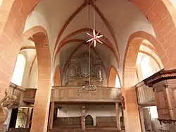 Die schlichte hölzerne Kanzel ist ein Werk vom Ende des 16. Jahrhunderts. Der Taufstein wurde 1821 geschaffen, außerdem sind Reste einer großen spätgotischen Sandsteintaufe erhalten. Ein lebensgroßer Kruzifixus aus dem späten 15. Jahrhundert wurde 1725 erneuert. Gegenüber steht eine Schnitzfigur des heiligen Sebastian vom Anfang des 16. Jahrhunderts, deren Arme im Jahr 1987 ergänzt wurden. Eine kleine Schnitzfigur des auferstandenen Christus ist ein Werk von 1507. An der Nordwand des Chores ist eine Sakramentsnische aus der Bauzeit eingelassen, die von einem Wimperg bekrönt wird, seitlich ist je eine kleine Figur in Hochrelief angeordnet. Im gleichen Wandfeld sind Reste spätgotischer Wandmalereien zu sehen, unter anderem die 1954 freigelegte Darstellung des Weltenrichters in der Mandorla. Zwei Grabsteine sind erhalten, einer mit geritztem Kreuz aus dem 15. Jahrhundert, der andere mit Inschrift und Wappen aus dem Jahr 1590.