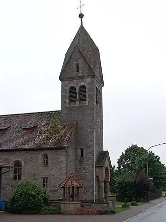 Der Kirchturm hat einen spitzen Helm und Zwillingsschallfenster mit Rundbögen. Er springt mit seiner halben Breite mittig aus der westlichen Wand des Langhauses hervor. Durch ihn betritt man das Langhaus mit Rundbogenfenstern, dessen Satteldach in Form einer Holzdecke innen sichtbar ist. Der halbrund geschlossene östliche Chor besitzt ein Tonnengewölbe und ebenfalls Rundbogenfenster.