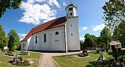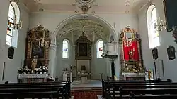 Die Saalkirche wurde 1619 nach einem Entwurf von Antonio Serro erbaut und um 1740 barockisiert. Sie besteht aus einem Langhaus, einem eingezogenen, dreiseitig geschlossenen Chor im Osten und einem Kirchturm im Westen, der später mit einem achteckigen Geschoss mit Pilastern an den Ecken, das die Turmuhr und den Glockenstuhl beherbergt, aufgestockt und mit einer Glockenhaube bedeckt wurde. 1773 wurde an der Nordwand des Chors unter seinem Schleppdach die Sakristei und an der Südwand ein Oratorium angebaut, in dem sich ein Werkzyklus über die vierzehn Nothelfer befindet. Der mit einem Triumphbogen vom Chor getrennte Innenraum des Langhauses, in dessen Westen sich eine Empore für die Orgel befindet, ist mit einer Decke mit Hohlkehle überspannt. Die Wände im Innenraum des Chors sind mit Pilastern gegliedert.