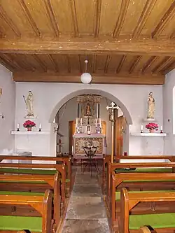 Die einschiffige Kirche besitzt im Osten einen zweigeschossigen Chorturm, der ursprünglich im Chorraum im Turmuntergeschoss ein gotisches Kreuzgewölbe besaß. Die Fenster im Langhaus wurden im 18. oder 19. erweitert und rundbogig geschlossen. Der Altar stammt aus dem Jahr 1766.