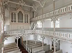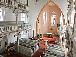 Der Kirchenraum ist so hoch, dass das Holzwerk des Dachstuhls freiliegt. Die auf diese Weise sichtbar hervortretenden bearbeiteten Balken wurden später weiß überstrichen.