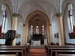 St. Simon und Judas Thaddäus wurde im Stil der Neugotik errichtet und gliedert sich nach den Sanierungsarbeiten 2010 in den freistehenden Fünfknopfturm und das Kirchenschiff. Das dreischiffige Kirchenschiff wird von einem Gratgewölbe überspannt.[1] Der Hochaltar stammt zu Teilen aus dem St.-Nikolaus-Hospital in Bernkastel-Kues. Weitere Stücke der Innenausstattung stammen aus der Zeit um 1900.[5]