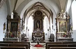 Der Innenraum des Langhauses ist mit einem Netzgewölbe über Konsolen überspannt. Der Entwurf des 1792 geschaffenen Hochaltars aus Stuckmarmor wird Wolfgang Hagenauer zugeschrieben. Die Altarretabel der Seitenaltäre hat 1859 Alois Dirnberger nazarenisch bemalt. Die Orgel wurde 1877 von den Gebrüdern Frosch gebaut.[1]