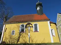 Die traufständige, romanische Saalkirche besteht aus einem Langhaus und einer eingezogenen, halbrund geschlossenen Apsis im Osten. Aus dem Satteldach des Langhauses erhebt sich im Osten ein sechseckiger Dachreiter, der die Turmuhr beherbergt, und mit einer Zwiebelhaube bedeckt ist. Der Innenraum ist mit einer Flachdecke überspannt. Zur Kirchenausstattung gehören ein um 1700 gebauter Hochaltar, dessen Altarretabel zwischen Säulen steht, die mit Akanthusranken verziert sind, klassizistisch aufgebaute Seitenaltäre und eine um 1500 gebaute gotische Kanzel, auf dessen polygonaler Brüstung Flachschnitzereien angebracht sind.