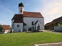 Die im Kern spätgotische Saalkirche vom Ende des 15. Jahrhunderts wurde im 18. Jahrhundert barock umgestaltet. Sie besteht aus dem Langhaus, dem eingezogenen Chor mit Fünfachtelschluss im Osten, einem Vorzeichen mit dem Portal an der Nordwand des Langhauses, der Sakristei an der Nordwand und dem Chorflankenturm auf quadratischem Grundriss an der Südwand des Chors. Die achteckigen Obergeschosse des mit einer Zwiebelhaube bedeckten Turms enthalten oben die Turmuhr und darunter den Glockenstuhl mit drei Glocken.