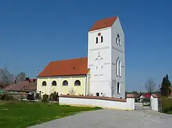 Die barocke Saalkirche wurde 1723 erbaut. Sie besteht aus dem Langhaus zu vier Jochen und dem Chorturm im Osten. Der mit einem Satteldach bedeckte Turm stammt aus der zweiten Hälfte des 13. Jahrhunderts. Das Geläut im Turm besteht aus vier Glocken. Der Innenraum des Langhauses ist mit einer Flachdecke mit Hohlkehle überspannt.