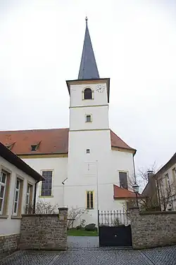 Die 1718–20 gebaute Saalkirche besteht aus einem Langhaus, einem eingezogenen dreiseitig abgeschlossenen Chor im Osten und einem Chorflankenturm an der Südseite des Chors, der auf einem Chorturm aus dem 14. Jahrhundert basiert. Das oberste Geschoss des mit einem achtseitigen Knickhelm bedeckten Julius-Echter-Turms beherbergt die Turmuhr und den Glockenstuhl. Der Hochaltar stammt aus der Bauzeit. Eine Pietà entstand um 1500.
