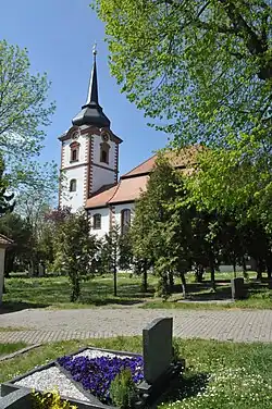 1740 bis 1744 wurde die Kirche an der Stelle eines mittelalterlichen Vorgängers einheitlich im Zopfstil errichtet.[2] Die verputzte, mit Ecksteinen versehene Saalkirche wurde 1863/64 renoviert. Das Kirchenschiff hat einen gestreckten, achteckigen Grundriss. Es ist mit einem abgewalmten Mansarddach bedeckt. Der oval ausgebildete Innenraum ist mit umlaufenden, zweigeschossigen Emporen versehen, in denen Logen eingebaut sind. Er ist mit einem hölzernen Tonnengewölbe überspannt, das verputzt ist und Spiegel aus Stuck haben. Der eingezogene Kirchturm im Westen ist durch einen Zwischenbau mit dem Kirchenschiff verbunden. Er trägt eine spitzen Helm. Die Portale sind durch Gebälk und Kartuschen verziert, das westliche ist mit Pilastern gegliedert und hat einen Gaffkopf im Giebel.