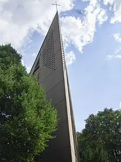 Die evangelische Kirche St. Stephanus in Gelsenkirchen-Buer, ein Spätwerk des Architekten Peter Grund, soll Teil eines Seniorenheims werden, das auf dem sie umgebenden Grundstück entsteht.