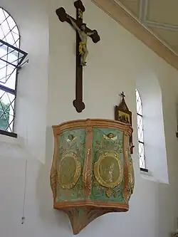 Der Putz der Chorturmkirche mit Steildach über dem fünfachsigen Langhaus ist neuromanisch gegliedert. Den quadratischen Chorturm krönt ein oktogonaler Aufbau mit Zwiebelhaube.[3] An der Nordwand ist eine frühere Eingangstür noch zu erkennen.[1] An der nördlich an den Turm angebauten Sakristei befindet sich nördlich eine gotische Ecknische, ein Pendant zum einfacheren Sakramentshäuschen im Chor.[4]