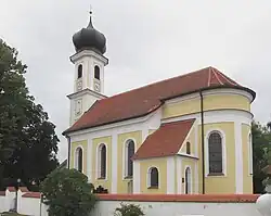 Die barocke Saalkirche wurde 1735 nach einem Entwurf von Johann Baptist Lethner erbaut. Sie besteht aus dem Langhaus zu drei Jochen, dem eingezogenen, halbrund geschlossenen Chor im Osten und einer Sakristei an der Südwand des Chors, die außen mit Lisenen gegliedert sind. Der Kirchturm auf quadratischem Grundriss steht im Westen. Sein oberstes Geschoss mit abgeschrägten Ecken enthält die Turmuhr und den Glockenstuhl. Darauf sitzt eine Zwiebelhaube.
