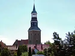 Der im Westen stehende Turm mit seinem steinernen Unterbau wurde 1489 bis 1499 errichtet. Er hat im unteren Bereich nach Westen eine gotisch-spitzbogige Fensteröffnung, weiter oben romanisch rundbogige Biforien. Das erscheint nach der Architekturgeschichte verwunderlich, aber der Backsteinturm der der Alexanderkirche in Wildeshausen weist eine ähnliche Verteilung der Stilformen auf. Bis 1703 hatte der Turm einen spitzen spätgotischen Helm. Nach einem Sturmschaden wurde das heutige barocke Dach geschaffen: auf dem Mauerabschluss sitzt eine Haube, die zu mehreren oktogonalen Konstruktionen überleitet, zunächst ein fensterloses Geschoss, darauf ein weiteres Haubendach, darauf eine offene Laterne mit einer angedeuteten Zwiebelhaube. Das krönende Kreuz befindet sich in 68 m Höhe.