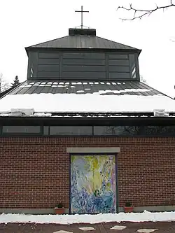 Die Kirche ist ein Zentralbau mit einem sechseckigen Grundriss (der Hälfte eines Achtecks). Über dem Altarbereich erhebt sich die Glockenstube, die von einem Zeltdach bekrönt wird. Der Entwurf lehnt sich dabei an mittelalterliche Chorturmkirchen, aber auch an frühchristliche und mittelalterliche Zentralbauten wie Santa Constanza in Rom oder die Pfalzkapelle Karls des Großen in Aachen an. Der Kirchenbau aus Sichtbeton und Vormauerklinker bildet in den verwendeten Materialien eine Einheit mit dem früher erbauten Gemeindezentrum, hebt sich andererseits durch die steilen Dächer und den turmartigen Aufsatz als Sakralbau deutlich davon ab. Das als Paradiestür gestaltete Portal in Emailtechnik stammt von Hanspeter Münch.