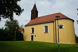 Die Saalkirche wurde Mitte des 18. Jahrhunderts erbaut. Sie besteht aus einem Langhaus und einem eingezogenen, halbrund geschlossenen Chor im Osten. Aus dem Dach erhebt sich im Westen ein quadratischer Dachreiter, der hinter den Klangarkaden den Glockenstuhl beherbergt, und der mit einem spitzen, mit Schindeln verkleideter Helm bedeckt ist.