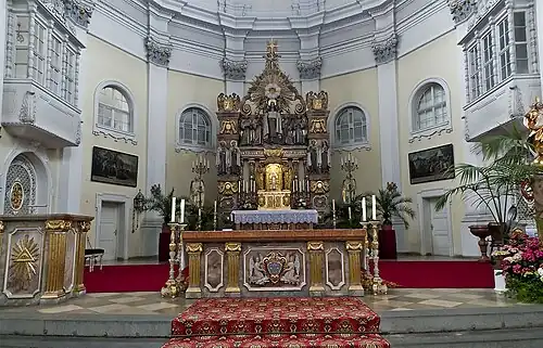 Den Übergang zum Chorraum bildet ein kurzes Vorchorjoch mit ausgerundeten Südecken. Breite Pilasterbündel, ein Stuckrahmen mit beidseitigen Volutenansätzen und eine bekrönende Kartusche mit dem Wappen des Karmeliterordens zeichnen den Chorbogen aus. Im eingezogenen, ausgeschiedenen Chor setzt sich die Gliederung des Langhauses fort. Da das Chorrund von niedrigen Anbauten umgeben ist, erfolgt die Belichtung ausschließlich durch längsovale Okuli in der Apsiskalotte.