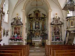 Die Kirchenausstattung besteht aus barocken Altären aus der Zeit um 1720. Der Hochaltar zeigt eine Pietà; die Heiligen Antonius von Padua und Franz von Assisi stellen die Seitenfiguren dar. Die Seitenaltäre sind dem heiligen Isidor und der heiligen Notburga gewidmet.