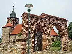 Der Markgraf Albrecht der Bär ließ 1140 die romanische Saalkirche als klassische vollständige Anlage in Bruchstein errichten.[2] Sie wurde dem Patrozinium des Apostels Thomas unterstellt.[3] Der Fachwerkaufsatz des mit einer Haube bekrönten Turmes wurde 1796 errichtet.[4]