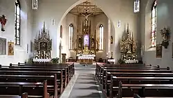 Der stattliche neugotische Sandsteinquaderbau steht am Hang des Schlossberges, östlich über dem Ortskern. Das Gotteshaus besteht aus einem eingezogenen, polygonalen Chor mit Fünfachtelschluss. Den Altarraum belichten vier spitzbogige Fenster mit zweibahnigem Maßwerk und überspannt eine hölzerne Flachdecke. Im nördlichen Winkel zum Langhaus befindet sich die Sakristei. Das Langhaus hat fünf Fensterachsen und ist mit dem Chor durch einen spitzbogigen Chorbogen verbunden. Es wird von einer hölzernen Flachdecke überspannt und hat ein verschiefertes Satteldach. In der westlichen Giebelwand steht der Fassadenturm.[3]