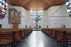 Die Innenraum wird nach oben durch eine holzverkleidete Decke abgeschlossen, die aus vier großen Fünfecken zusammengesetzt ist. Der helle Gemeinderaum bietet etwa 500 Besuchern Platz und ist damit der größte Kirchenraum des Stadtteils. Die Kirchenausstattung ist entsprechend der Erbauungszeit der Kirche schlicht und modern gehalten, er konzentriert sich auf das Wesentliche und setzt die liturgische Reform des Zweiten Vatikanischen Konzils um. Der massive Altarblock aus hellem Granit ruht auf einem kleineren Granitblock. In den Altar wurden Reliquien des Namenspatrons eingelassen. Unterhalb des Westfensters korrespondiert das nach vorne geöffnete, aus Granit gemeißelte Tabernakel mit dem Altar.[6]