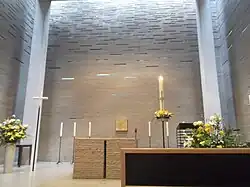 Die in Zusammenarbeit zwischen Norbert Radermacher und den Architekten Thomas Höger und Sarah Hare erbaute Saalkirche auf rechteckigem Grundriss ist flachgedeckt. Als rechteckiger steinerner Kubus hebt sie sich deutlich ab als eigener Baukörper zwischen dem Altbau der Katholischen Akademie und dem zugehörigen Hotel. Im Erdgeschoss legt sich ein Skelett aus Stahlbeton um den Baukörper der Kirche, der verglast ist. Dieser Wandelgang, eine Assoziation an einen Kreuzgang, bildet ein verbindendes Element zu den beiden angrenzenden Baukörpern. Das Kirchenschiff ist ein Mauerwerksbau, dessen Mauern aus Granit geschnittenen, 60 cm langen und 4,5 cm flachen Steinen bestehen, die im schleppenden Läuferverband vermauert sind. Die fensterlosen Wandflächen werden von unregelmäßig versetzten Glasbausteinen mit den gleichen Abmessungen wie die Granitsteine durchbrochen, die nach oben zunehmen, wodurch sich die Schichtung des Granits optisch verliert. Die Glasplatten bilden ein abstraktes Muster auf der Kirchenwand und lassen tagsüber ein diffuses Licht in den Raum dringen.