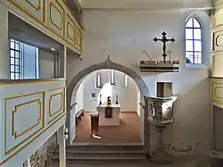 Der Innenraum erhielt seine jetzige Form als dreischiffige Emporenhalle mit Brettertonne über dem Mittelschiff und zwei Emporengeschossen in den Seitenschiffen im Jahr 1696. Da das Mittelschiff mit seiner Spitzbogentonne stark überhöht iat, lässt sich die Kirche auch als Pseudobasilika auffassen. Die Kanzel steht an der Stelle, an der sich in der Zeit der Zweischiffigkeit eine steinerne Arkade anschloss, die den Kirchenraum in zwei Schiffe unterteilte. Der Triumphbogen stammt vom romanischen Vorgängerbau, dessen Altarraum – eine halbrunde Apsis – im 14. Jh. durch den Chorturm ersetzt wurde.