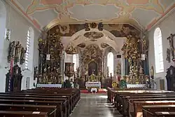 Der Innenraum des Langhauses ist mit einer Flachdecke überspannt, der des Chors mit einem Stichkappengewölbe, der der Sakristei im Erdgeschoss des Chorturms mit einem Kreuzrippengewölbe. Die Fresken am Chorbogen stammen von Ignaz Günther, die Wandmalereier im Chor hat 1920 Anton Niedermaier angefertigt. Zur Kirchenausstattung gehört ein 1765 gestifteter Hochaltar, der von Statuen des Johannes Nepomuk und der heiligen Afra flankiert wird. Auf dem Altarretabel ist der heilige Ulrich dargestellt.