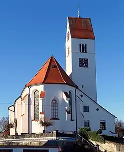 Die 1478 geweihte Saalkirche wurde um 1720/30 der Innenraum barock umgestaltet und 1863 neuromanisch verändert. Sie besteht aus einem Langhaus, an dem beidseitig Risalite angefügt sind, einem eingezogenen, dreiseitig geschlossenen, von Strebepfeilern gestützten Chor im Osten und einem Chorflankenturm an der Nordwand des Chors, der quer mit einem Satteldach bedeckt ist. Sein oberstes Geschoss beherbergt hinter den als Triforien gestalteten Klangarkaden den Glockenstuhl mit fünf Glocken. Die Zifferblätter der Turmuhr befinden sich im Geschoss darunter und im Giebel. Zur Kirchenausstattung gehört ein Hochaltar, dessen Altarretabel 1865 Johannes Kaspar bemalt hat.