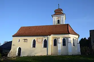 Das Langhaus und der leicht nach Süden abgeknickte, eingezogene, von Strebepfeilern gestützte Chor mit Fünfachtelschluss im Osten stammen aus dem 15. Jahrhundert. Der Chorflankenturm an der Nordwand des Chors wurde 1773 durch den Einschlag eines Blitzes beschädigt. Er wurde 1790 nach einem Entwurf von Johann Martin Kapfer erneuert. Er erhielt Pilaster an den Ecken und wurde mit einer zweigeteilten, geschwungenen Haube bedeckt. Sein oberstes Geschoss beherbergt die Turmuhr und den Glockenstuhl. Der Innenraum des Langhauses wurde 1964 mit einer Holzbalkendecke überspannt, der des Chors mit einem Kreuzrippengewölbe, dessen Schlusssteine mit Wappen verziert sind. Um 1450 wurde an der Spitze des Chorbogens ein Fresko angebracht, auf dem das Jüngste Gericht dargestellt ist. 1908 wurden gotische Decken- und Wandmalereien aufgedeckt, u. a. der Kopf eines Schmerzensmanns und die Evangelistensymbole.