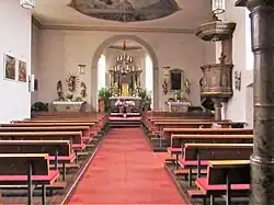 Der Taufstein entstand im Jahr 1571[1]; die Kanzel stammt aus dem Jahr 1692[1]. Der Hochaltar ist mit barocken Figuren des Gekreuzigten, des Apostels und Evangelisten Johannes sowie des hl. Sebastian ausgestattet.[1]