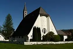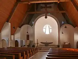 Die moderne Saalkirche besitzt ein steiles Krüppelwalmdach mit einem Dachreiter. Durch Mauern angedeutete Apsiden und der offene Dachstuhl prägen den Innenraum.[1] In den weißen Mauerflächen sind bunte Glasfenster eingearbeitet.[3]