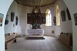 Eine Besonderheit der Kirche sind die bemalten Holzdecken von Chor und Schiff, die aus einfachen Längsbrettern mit zwischengesetzten Leisten bestehen. Die Leisten wurden durch Schablonenmalerei und Schriftbänder reichlich verziert. Neben schlichtem geometrischen Gitterwerk dominieren Fischblasenmaßwerk, feingliedrige Rosetten und Ranken mit Blüten das Erscheinungsbild. Die Charakteristik der kleinteiligen Malerei deutet auf die Ausläufer der Gotik um 1500 hin. Beim Hochaltar handelt es sich um einen spätgotischen Flügelaltar mit Mittelschrein, Predella und Aufsatzgesprenge. Dargestellt ist die Beweinung Christi. Der 1521 fertiggestellte Altar wurde 1741 durch eine Neuschöpfung des Judenburger Bildhauers Balthasar Brandstätter ersetzt.[5] Die Kirchenwände sind ringsum durch Heiligenfiguren und Passionsbilder geschmückt.