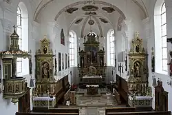 Das einschiffige Langhaus erstreckt sich über vier Joche und ist von einer Korbbogentonne mit Stichkappen überwölbt. Es mündet im Osten in einen eingezogenen, um eine Stufe erhöhten quadratischen Chor mit halbkreisförmiger Apsis. Der Chor besitzt ein Kreuzgratgewölbe, an das sich die Halbkuppel der Apsis anschließt. Den westlichen Abschluss des Langhauses bildet eine doppelte Empore, wobei auf der oberen die Orgel aus der Mitte des 18. Jahrhunderts untergebracht ist. Die Wände gliedern flache Pilaster mit profilierten Kapitellen.