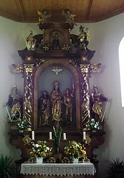 In der Mitte des Hochaltarschreines aus dem 17. Jahrhundert befindet sich Maria die Mutter Jesu von Nazaret, umrahmt von Benedikt von Nursia und Georg, über Maria der Heilige Geist, in der Darstellung einer Taube. Links und rechts des Schreines, als barocke Seitenfiguren Katharina von Alexandrien und Barbara von Nikomedien.[1]