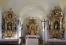 Der Hochaltar wird von den vermutlich aus dem 15. Jahrhundert stammenden, im 18. Jahrhundert stark überarbeiteten Skulpturen des Martin von Tours und des heiligen Veit flankiert. Im zentralen Altarbild ist der heilige Nikolaus dargestellt, zu erkennen an den drei Goldkugeln auf dem Buch in seiner rechten Hand. Das Gold schenkte er einer armen Familie, damit sie genug Geld hatte und die Töchter nicht der Prostitution preisgeben musste.