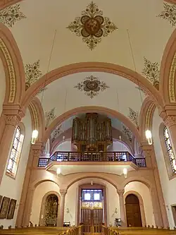 Der Kirchenraum ist mit Hängekuppeln, sogenannten "Böhmischen Kappen", überwölbt. Diese Gewölbeausbildung gleicht dem Kuppelgewölbe. Sie unterscheiden sich jedoch darin, dass bei der Böhmischen Kappe der Grundkreis außerhalb des zu überwölbenden rechteckigen oder quadratischen Raumes liegt. Somit ergeben sich Wandbögen in Segmentbogenform. Die Kuppeln zeigen ausgehend vom Hauptportal in Richtung Apsis Deckengemälde mit den Darstellungen von König David mit der Harfe, Aaron in priesterlichen Gewändern, Mose mit den Gesetzestafeln sowie den Priesterkönig Melchisedek bzw. den König Salomo mit Kelch und Patene jeweils in Rundmedaillons umgeben von Vierpässen und floralen Rahmen. Auch die Zwickel der Kappen sind mit floralen Ornamenten geschmückt.