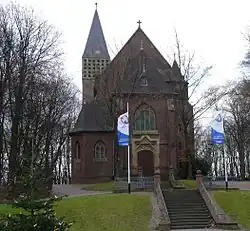 Der neugotische, kreuzförmige Backsteinbau mit Treppenturm in Chorwinkel und einer Westvorhalle mit Sakristei wurde von 1902 bis 1905 nach Plänen von Caspar Clemens Pickel errichtet und nach der Sprengung von 1945 in modernen Formen wieder aufgebaut.