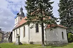 Der Turm wird von einer schiefergedeckten Haube mit Laterne und aufgesetzter goldener Turmkugel gekrönt. Unter einer Dachgaube in der Haube zeigt ein weißes Zifferblatt die Uhrzeit in südliche Richtung. Im Glockenstuhl hängen zwei Glocken, die ihren Klang durch vier Klangarkaden in alle Himmelsrichtungen erschallen lassen. Ein mit roten Biberschwanz-Dachziegeln gedeckter hölzerner Treppenaufgang an der Südwestecke des Turms führt in sein erstes Geschoss. Von dort geht es über eine enge Treppe zum Glockenstuhl. An der Ostseite des Turms schließt sich das geostete Kirchenschiff an, das etwas breiter als der Turm ist. Sein Satteldach ist mit roten Ziegeln gedeckt, ebenso wie der dreiseitige Choranbau mit der nach Osten abschließenden kleinen Sakristei. Das Tageslicht erhellt den Kirchenbau durch vier Spitzbogenfenster in der Südseite, zwei ebensolche Fenster in der Nordseite und zwei Chorfenster. An der Nordseite des Schiffes steht ein etwa vier Meter hohes schmuckloses Kreuz. Vor der Südfassade erinnert ein Mahnmal an die in den Kriegen gefallenen oder vermissten Soldaten. In den Jahren 2008 und 2009 wurde der Turm saniert und mit einem neuen Turmknopf versehen. Der Hauptteil des Friedhofs liegt im Norden der Kirche.