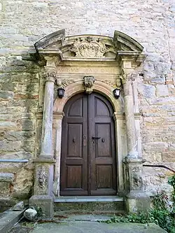 Im Aufgangsbereich zur Patronatsloge ist eine Gedenktafel für die Gefallenen des Ersten Weltkriegs angebracht.