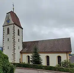 Die Saalkirche wurde 1734 gebaut, nachdem der Vorgängerbau von 1594 im Dreißigjährigen Krieg stark beschädigt worden war. Sie besteht aus einem Langhaus, einem Chor im Osten mit Fünfachtelschluss, einem Chorflankenturm an der Nordwand, der im Kern von einer Wehrkirche stammt, und der Sakristei an der Südwand.