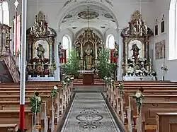 Die barocke Kirchenausstattung wurde mehrfach umgestaltet. Der dem heiligen Vitus geweihte Altar wurde von Pfarrer Dominikus Waldner 1746 auf eigene Kosten errichtet. Vier Figuren der Evangelisten Matthäus, Markus, Lukas und Johannes in den flachen Muschelnischen am polygonalen Korpus der jetzigen, neubarocken Kanzel stammen noch aus der Zeit des Kirchenbaus. Bei der Renovierung 1923 wurde ein Wandgemälde freigelegt, das Szenen aus der Vitus-Legende von 1711 zeigt.
