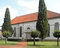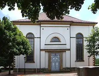 Zur Westseite erhebt sich die mit zwei Säulen betonte Empore mit Orgel und Orgelprospekt. Im Süden, Norden und Westen kann das Gebäude durch Portale betreten werden, das Westportal ist der Haupteingang.