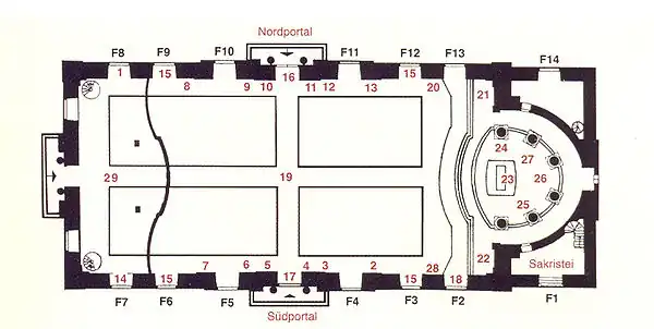 Nach dem revidierten und reduzierten Bauplan des Baumeisters Schmidt hat das rechteckige Kirchenschiff eine Länge von 48, eine Breite von 24 und eine Höhe von 13,5 Metern.