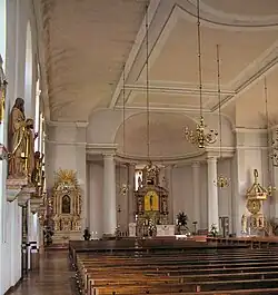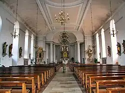 Die Pfarrkirche St. Vitus ist als Saalkirche einschiffig. Das Kirchenschiff wird von einem lachsfarben getönten hängenden Spiegelgewölbe von 51,50 Meter Länge und 43 Meter Breite überspannt, das im Bereich des Altarraums von einer in Weiß gehaltenen sechsteiligen Säulengruppe gestützt wird. Wie üblich ist der Chor als Sinnbild der „Neuen Sonne“ bzw. der Auferstehung Christi nach Osten ausgerichtet. Dort befindet sich auch der Zugang zur Sakristei.