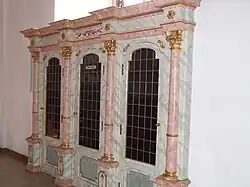 Die Westwand der Kirche wird von der Orgelemporenbrüstung mit Orgelprospekt eingenommen.