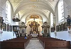 Das Langhaus wird von einem Tonnengewölbe Stichen überspannt, das auf einfachen Pilastern und Gurtbögen ruht. Es wird von stuckgerahmten Feldern gegliedert. Zu beiden Seiten zweigen flache Stiche aus dem Hauptgewölbe ab. Der durch einen runden Chorbogen abgetrennte Altarraum wird ebenfalls von einer Stichkappentonne überwölbt, wobei die Pilaster hier verkröpfte Kapitelle aufweisen. Die Sakristei im Turmerdgeschoss weist ein spätgotisches Netzgewölbe mit birnstabförmigen Rippen auf, die auf gefasten Wandpfeilern mit einfachen Spitzkonsolen ruhen. Das Gewölbe weist spitze Schildbögen auf.[3][4]